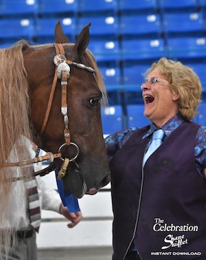 Six entries competed for the world championship in the Owner-Amateur Riders on Western Park Pleasure Walking Horses class. Armed But Kid’N and Jason Joseph were called to victory lane for owner Sister Milligan of Panama City, Florida. It was the second blue ribbon of the Celebration for Armed But Kid’N. The red ribbon went to A Titleist Masterpiece with Blake Cammack in the saddle for Champion Stables. The golfing theme continued with Dr. Golf earning third with Jennifer Bingham for the Bingham and Hill partnership.
