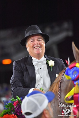With the crowd on its feet and clapping seven entries entered the big oval in the Tennessee Walking Horse World Grand Championship Stake. Rollie Beard presided over the class. After two workouts and the traditional conformation examination, it was time for the spotlight to search for the 2020 World Grand Champion. This year, the spotlight landed on Master’s Razzle and Jazz and John Allan Callaway who rode to the ultimate award in the walking horse industry for The Alan Riddley Family from Shelby, North Carolina. It is the first World Grand Championship Stake win for John Allan, though he is no stranger to many other top titles. Following the win, John Allan was congratulated in the ring by his father Allan and brother Bill who have also made the World Grand Championship ride.