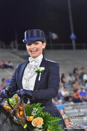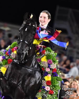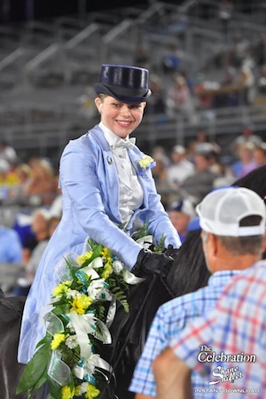 Six entries competed for the Owner-Amateur Riders on Walking Ponies World Grand Championship as the call judge. Skywalk’s Threat won the world grand championship with Julia Glidewell making the spotlight ride for owners Michelle and Steve Glidewell of Corinth, Mississippi. They have won three blues this year including the Owner-Amateur Walking Ponies-Stallions class earlier in the Celebration. Pappy Van Winkle and Kim Butler were reserve for Bruce Butler. Strike and Lisa Baum tied third.