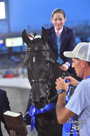 Division B of the Owner-Amateur Novice Lady Riders on Novice Walking Mares & Geldings proved to be the largest class of the night with 18 entries. Also winning her first Celebration world championship was Ashley Rea aboard Punisher for Barbara Smith of Columbus, Mississippi. Jose’s Lilly Rose and Elizabeth Tew placed second for Madeline and Kimble Tew. The Florida Line and Lisa Enfinger received the third award.