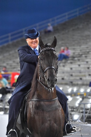 One of the most anticipated competitions of the Celebration was the Two-Year-Old Walking Stallions and Section A did not disappoint with 14 strong entries put through their paces by call judge Rollie Beard. Kobe 24, wearing No. 24, was a crowd favorite with Tim Smith in the saddle for the world championship performance for the partnership of Barnes, Conner and Kilgore from Sevierville, Tennessee and Tuscaloosa, Alabama. Kobe 24 was the unanimous choice of the five-judge panel. The pair remain unbeaten with four victories this year. Balboa and Casey Wright earned second for Alan Riddley. He’s A High Dollar Deal was third with Charlie Green in the stirrups for Don Collins.