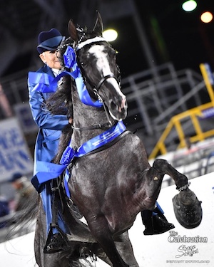 Robin MacDonald and Mr. Heisman were the across the board selection for the world championship in the Elite Owner-Amateur Lady Riders on Walking Stallions class. The duo has been the world champion in the class for four years in a row for co-owner Bruce MacDonald of Lake City, Georgia. It was the fourth win in an unbeaten season for Mr. Heisman with one blue claimed by Tim Smith as the rider. He’s Shady In Black and Sarah Coffee Burks tied second. My Major Or Deal was ridden to third by Debbie Eichler for Rising Star Ranch. Nine entries competed in the class.